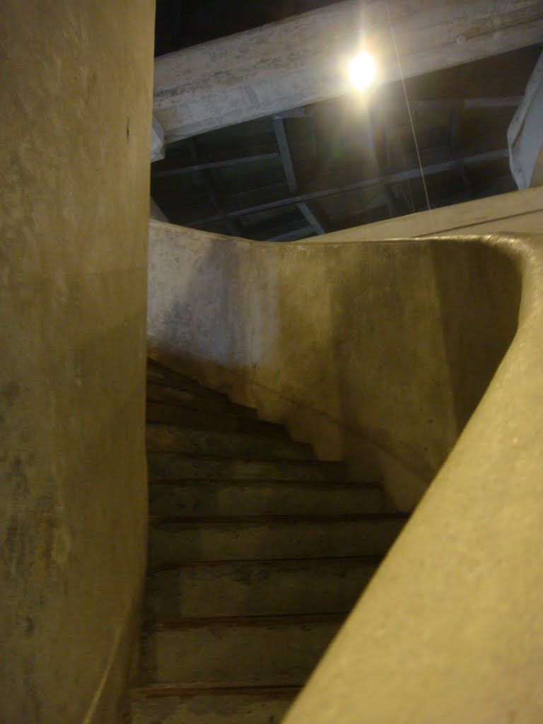 因為這棟建築原來是屠宰場,所以設計得很特殊,所有廊道、走到都是「人畜」分離,而室內大角度的旋轉樓梯,以及非常陡的樓梯,是為了怕被屠宰的牲畜暴動撞傷人,所以刻意設計成這個樣子,而畜生的走道可以說是一種無障礙坡道,從一樓可以直通到四樓。而整個建築物的柱子,都被裝飾成八角形的傘狀,也是他的特色之一。